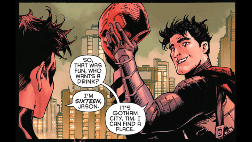 Dick Grayson isn’t Bruce’s compassion. He’s compassionate in a way that Bruce sometimes isn’t, but that doesn’t mean that compassion defines his character 100%. Jason Todd – Jason Todd isn’t Bruce’s rage. I mean, let’s talk about the fact that it’s been over twenty years and Jason is still seen as the “angry” Robin. That’s weak characterization right there because the anger is not and should not be everything that Jason is. And Tim Drake is smart, but he’s smarter than Bruce in some ways. He’s also a kid, a dork, a tech savvy teenager who’s been exceptional all his life (according to previous canon considering that we barely know anything about Tim this time around).