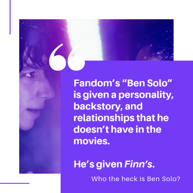 You’re 100% on point: Fandom’s Ben Solo is just one more way that the Star Wars fandom lets us know that Finn (and Black fans by assumption) can’t have anything. BS is well… bullshit. And the fandom needs to stop clinging to this idea of Kylo where he’s a soft secret prince that actually just tripped headfirst into fascism but needs the love of a good Rey to turn him back to the light.