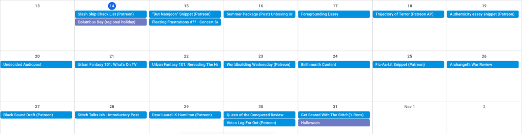 This month, we’ve got a lot (potentially) going on. We’re seeing lots of prime October content in that pretty much everything I’m writing and posting is either self-indulgent or spoopy. Some of them are a little bit of both.