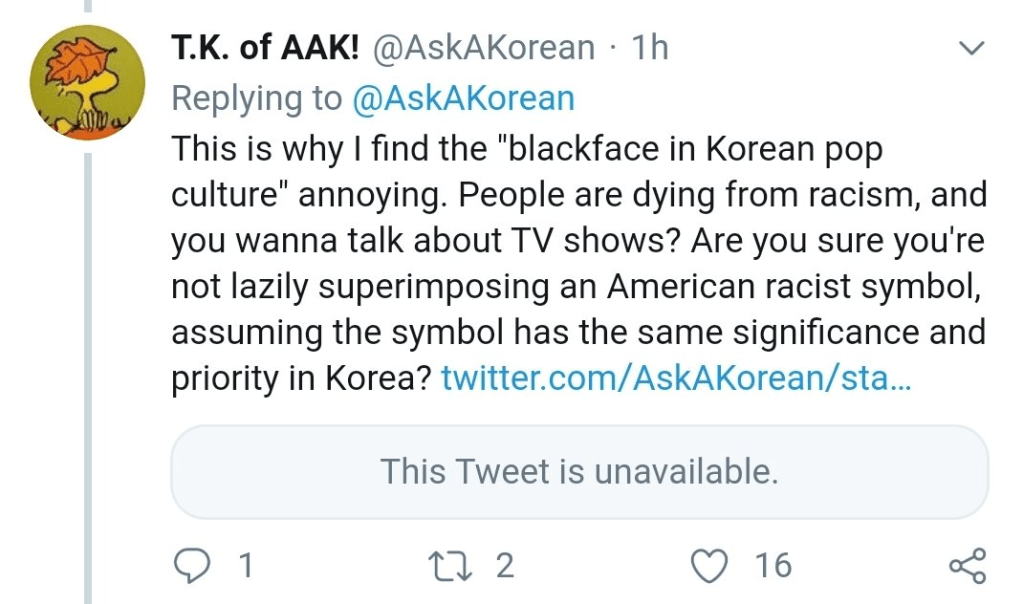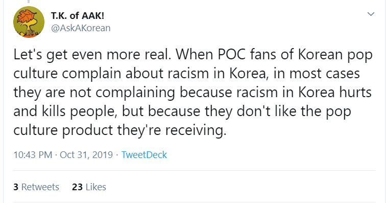 Like Ask A Korean’s TK Park who, on October 31, 2019 wrote a (likely now-deleted) whole thread (and supplementary tweets) excusing blackface in Korean entertainment that included such gems as: