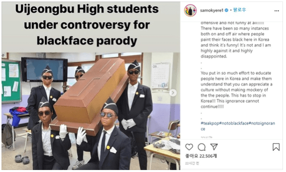 This is an ongoing and unaddressed issue harming people now that is seen as so necessary and integral to some Korean people’s entertainment that we’re not just seeing popular actors doing it in the dramas and films they’re doing now, but teenagers blacking up in Korean high schools (including some doing it on purpose to harm Sam Okyere primarily for daring to offer empathy and education.)