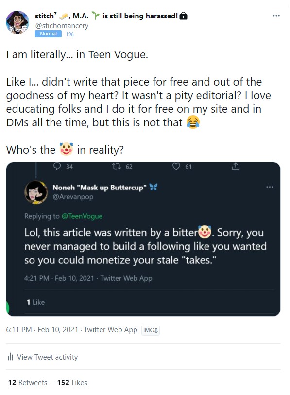 In February (Black History Month, US edition) I was being harassed to the point of severe mental health issues over fandom by hundreds if not thousands of people who had either “BLM” or “anti-harassment” in their bios. Someone tweeted something like “Teen Vogue will let anyone write there/get a byline”, but… that’s not true. We know that’s not true because it’s my column, no one else’s.