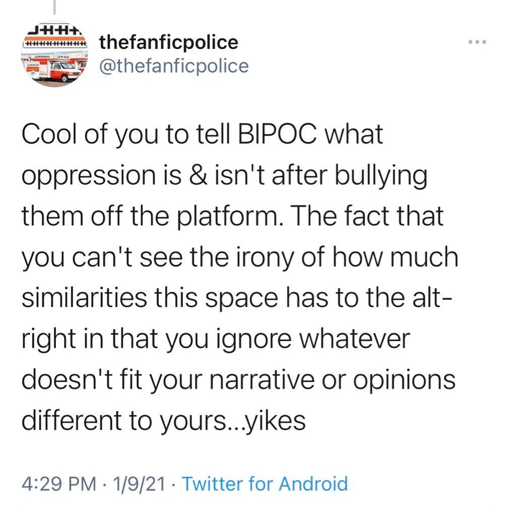 That is apparently equal to me not minding my business or providing unsolicited criticism (even though I do not @ anyone and am not telling people “hey @PERSON, YOUR SPECIFIC THING YOU HAVE DONE IN YOUR FIC/ART is racist”).