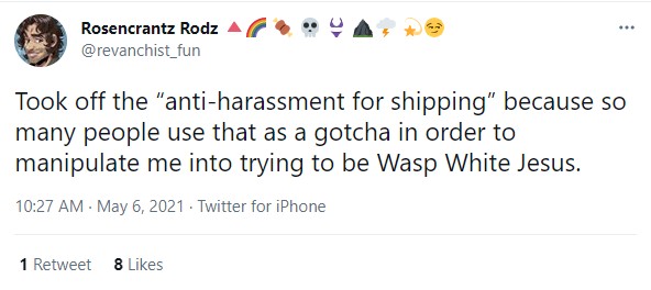 - The very real threat of me being doxxed in the name of “freedom in fandom/of fic” by people who claim that they’re “anti harassment” (but conveniently only ever when it comes to fiction/shipping… nothing else).