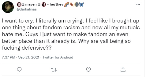 I know that’s a stunner because one thing they keep insisting is that they do care. They care so much that they’re actually even better antiracists than Black people and other people of color just trying to talk about what they are experiencing in fandom spaces. After all, they donate to the ACLU and they hate hate speech laws – for the safety of POC, of course, somehow – look at that instead of their embarrassingly transparent and racist responses to fans of color in fandom who try to talk amongst ourselves about racism in fandom.