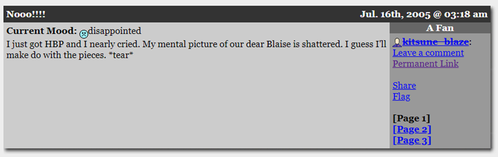 Now-deleted LiveJournal user kitsune_blaze (whose first post was barely two weeks previous) made a post titled “Nooo!!!!” with “disappointed” as their current mood:
