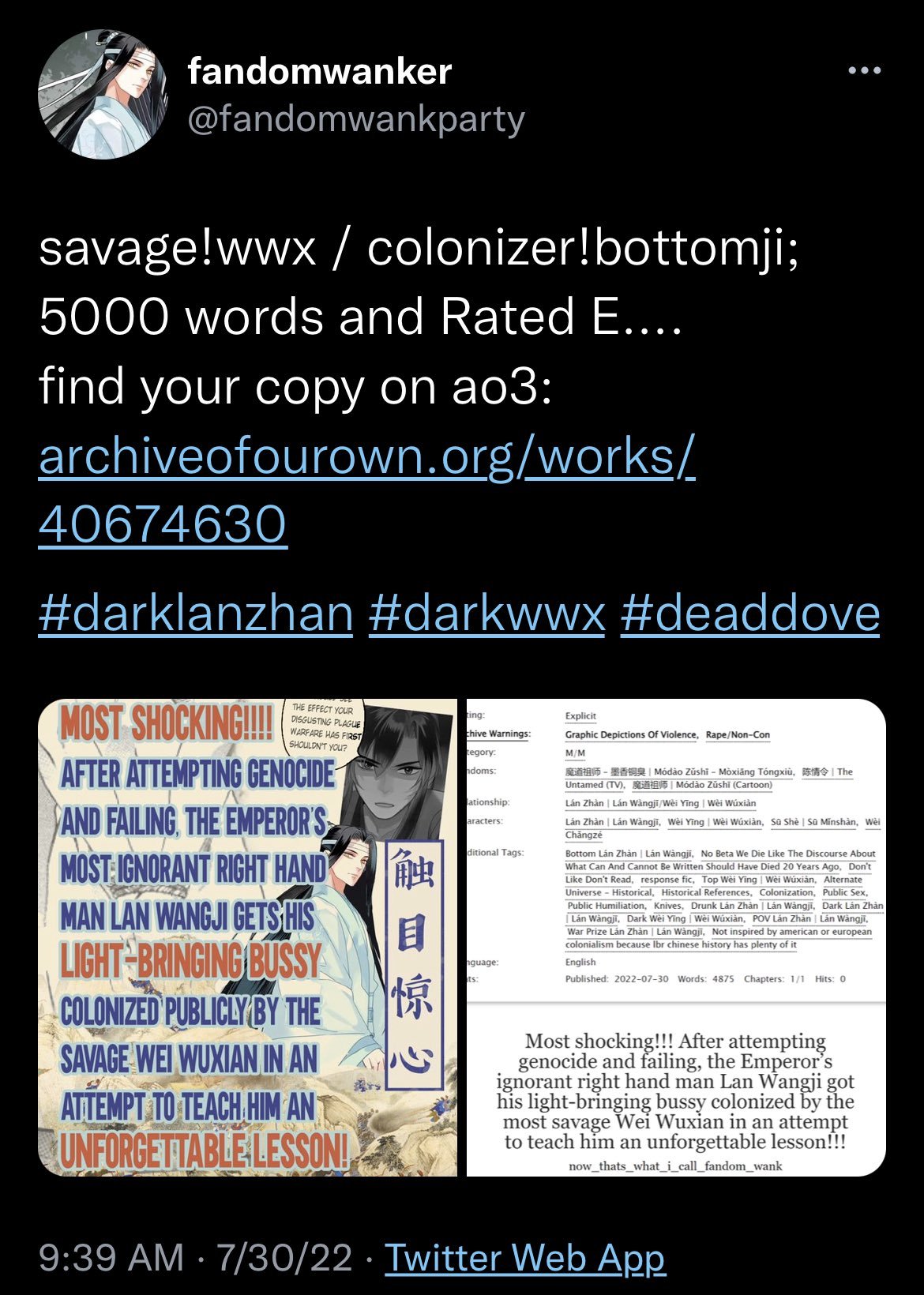 Take the fandom for MXTX’s GrandMaster of Demonic Cultivation (Mo Dao Zu Shi) this past week. A user, I’ll redact for the time being, made a twitter thread about a potential story where cultivator Lan Wangji is a “colonizer” and Wei Wuxian was essentially analogous to an Indigenous American… and then at the end wrote the following endnote: