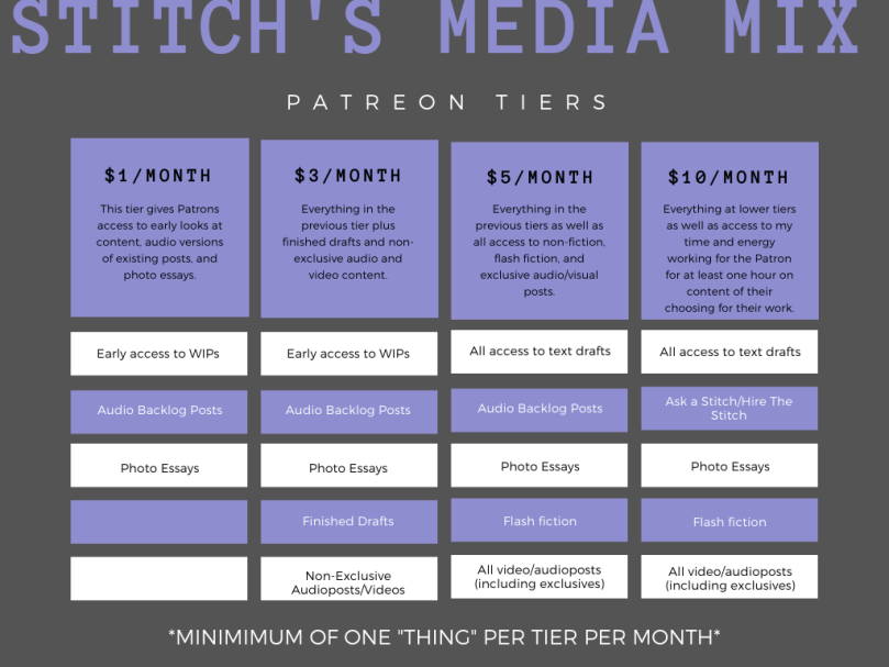 I keep forgetting to update patrons (and people who might want to become patrons) about what’s going on on the my Patreon page. So here’s what’s gone on recently and what you can expect in the future!