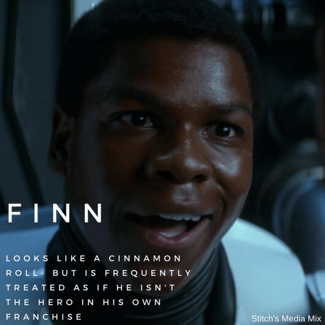 Throughout much of the Star Wars fandom in the wake of Star Wars: The Force Awakens male lead Finn (played by John Boyega) has been assigned the marker of the “True Cinnamon Roll”. Here’s the thing, I get where it comes from and as with Bodhi, I think that it comes from a well-meaning place but doesn’t bother to reckon with intersectionality or the reality of how Finn is treated by a significant portion of fandom both on and off of Tumblr.