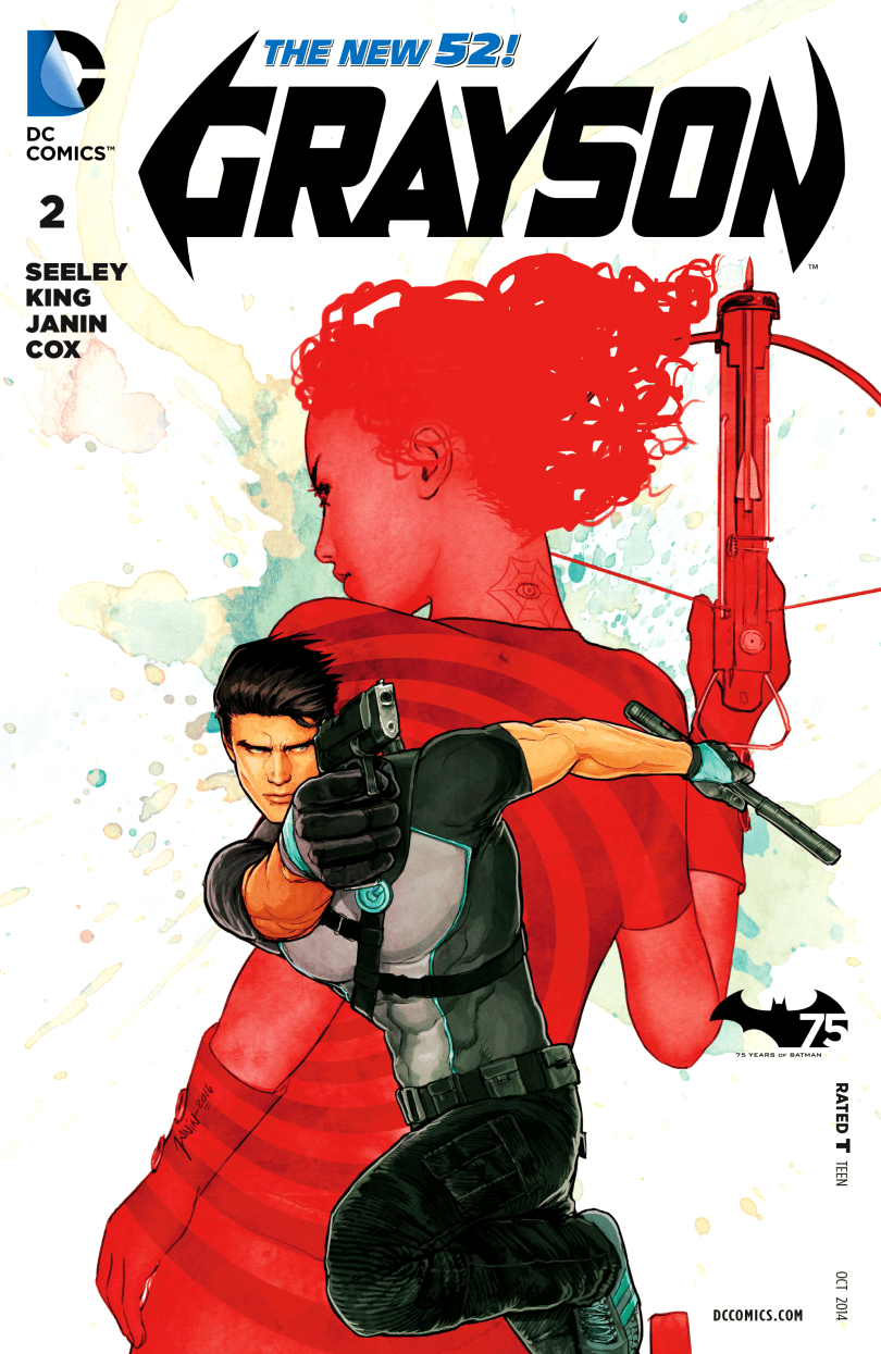 Grayson was a series primarily created by the writer duo of Tim Seeley and Tom King with art primarily by Mikel Janin, colors by Jeromy Cox, and letters by Carlos M. Mangual. There are other writer and artist teams across this series, most notably for the final arc once the main workers were placed on other DC books. We’ll get to them in a minute since naming them will be going in hand with me fussing about them.