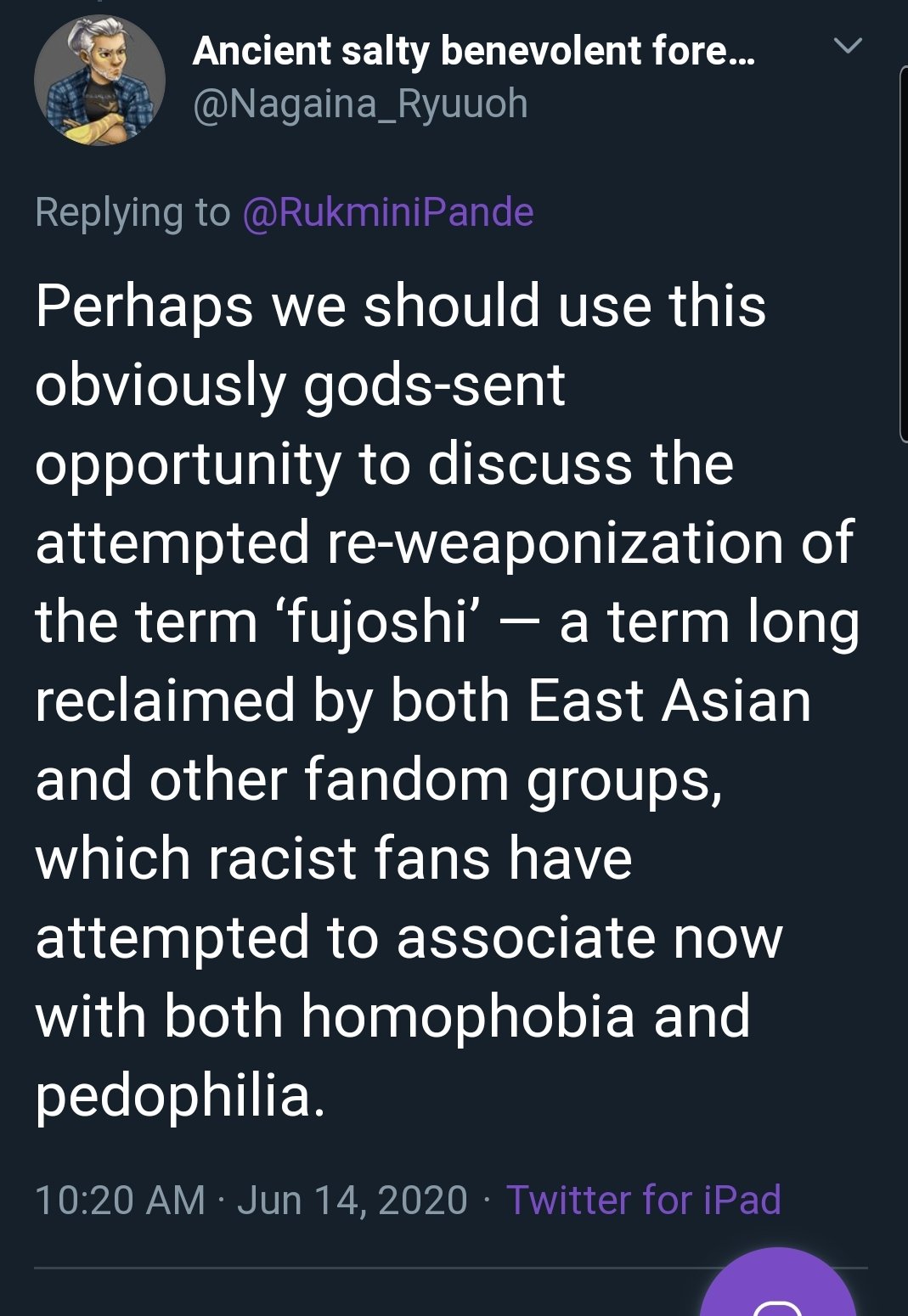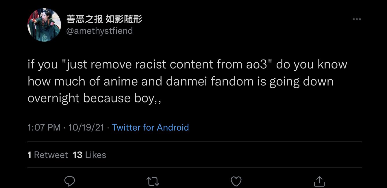 Anyone who is seriously using the word "fanpol"/"fan police" to write off conversations about racism in fandom and in some of the works hosted on the AO3/the racism done on the platform and in defense of it… Really cannot be taken seriously imo (& might be racist tbh)