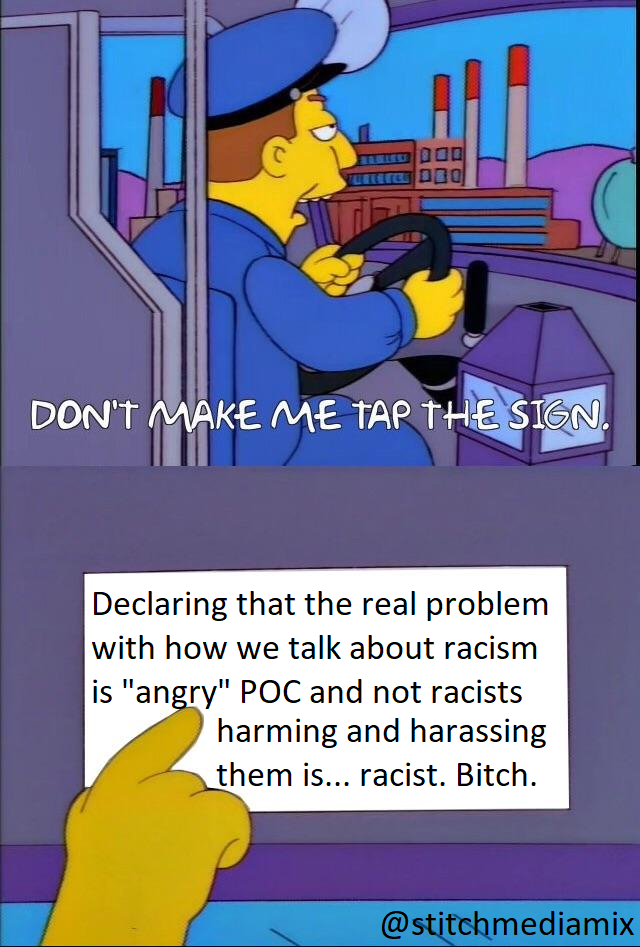Why do racists keep getting to define the rules of engagement? Why do they get to position themselves as neutral and unbiased, when they’re clearly biased in favor of white supremacy in a given space? Why is it that racists get to declare POC “too angry” to listen to and have people listen to them instead… As they angrily insult the “too mean” POC simply asking people to stop being less racist. Do people think this isn’t their entire goal? To make listening to anti racists/stopping racism in any space or capacity too hard or scary to do.